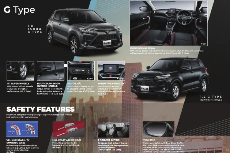 Toyota Raize 2024 kemungkinan masih menawarkan pilihan mesin 1.2L naturally aspirated dan 1.0L turbo. Beberapa varian yang mungkin ditawarkan: